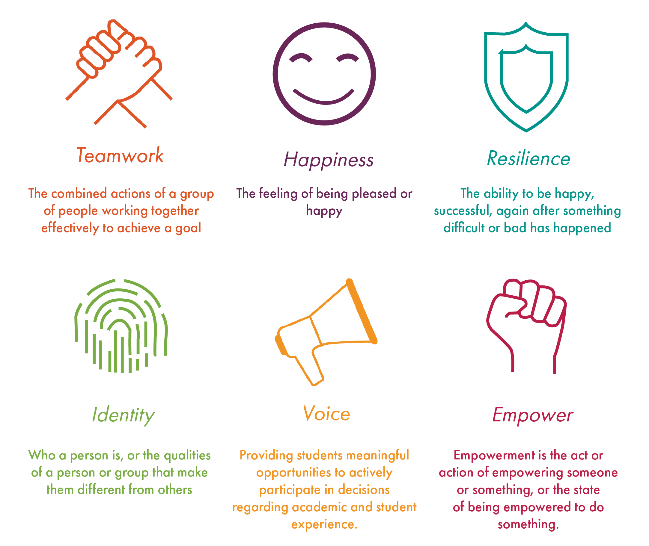 The icons were designed to sit outside the logo as separate assets. They have been used alongside definitions to highlight the core themes and values associated with each concept.