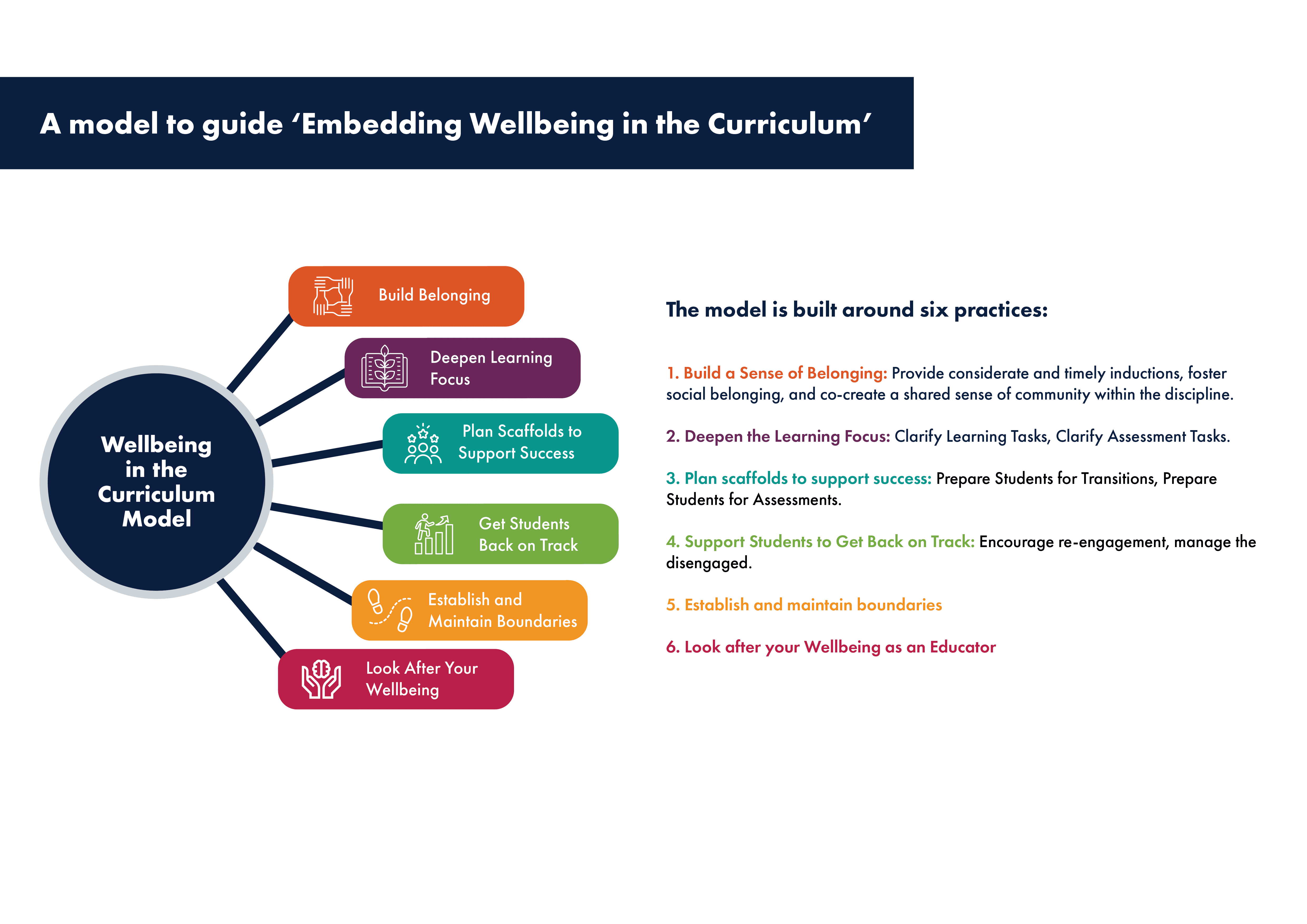 I designed the model in Illustrator to highlight the six practices for embedding wellbeing in the curriculum. Each practice has its own colour, to indicate that they are each unique and equally important in the curriculum.